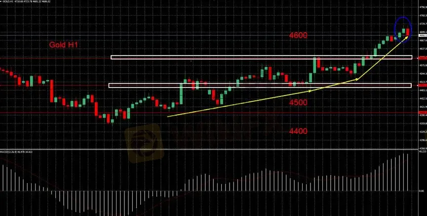 Ngược lại, nếu giá quay xuống dưới 4600 và histogram MACD thu hẹp, cần cảnh giác với khả năng chuyển sang trạng thái đi ngang tích lũy trong ngắn hạn.
