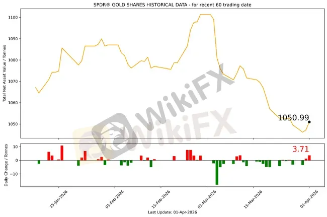 截至2026年04月01日,全球最大的黄金ETF SPDR Gold Trust持仓量为1050.99吨,较上一个交易日增加3.71吨。2026年04月01日现货黄金自4678.03美元/盎司开盘后呈现明显震荡上行走势,美盘交易时间最高向上触及4792.87美元/盎司,最终收于4758.1美元/盎司,涨80.07美元或1.71%。