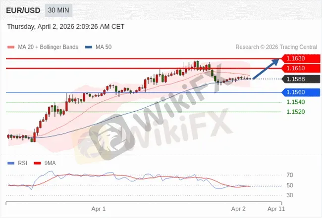 交易策略: 在 1.1560 之上,看涨,目标价位为 1.1610 ,然后为 1.1630。