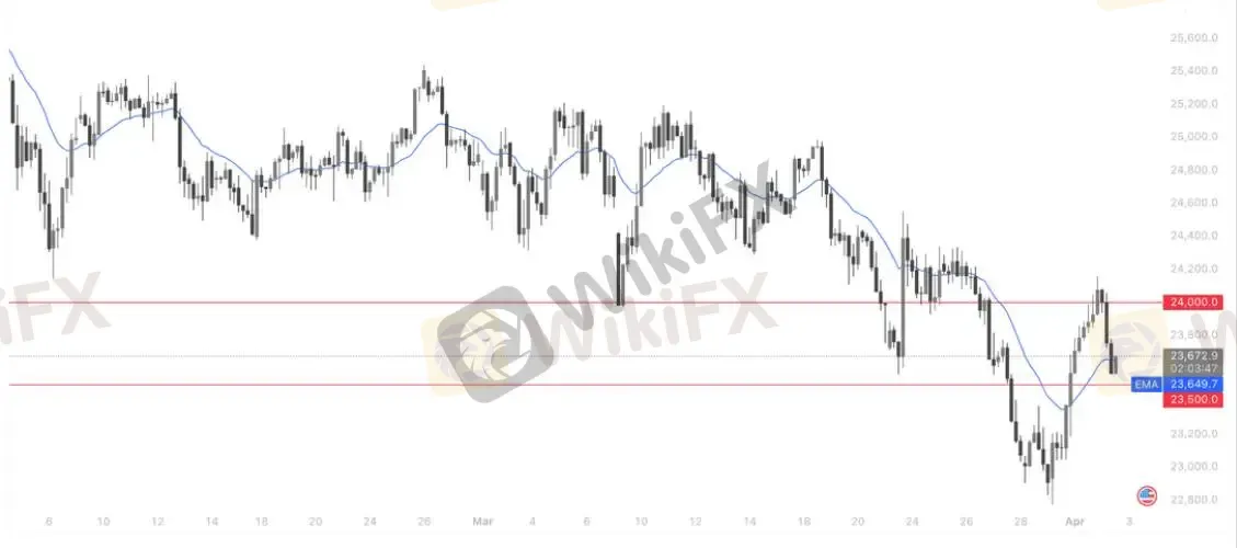 纳指100自 24,000 一线冲高回落后,目前在 23,500 上方获得阶段性支撑,短线回踩确认动作基本完成。从结构上看,价格仍运行于关键均线附近,叠加低位承接力度尚可,整体多头格局尚未被完全破坏,市场仍具备进一步反弹的基础,24,000 将再次成为阻力位。