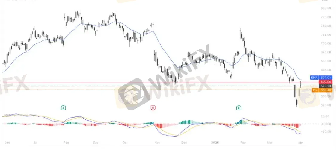 值得关注的是,570 区域为前期低点与短线支撑重叠位置,当前初步出现止跌迹象,若后续能够站稳并向上突破均线压制,或带来阶段性修复行情。但若反弹无力再度回落并跌破该支撑,则下行趋势可能延续,进一步打开回调空间。