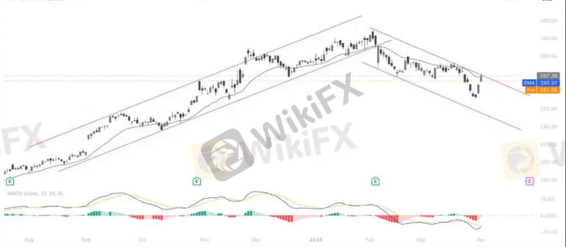 价格自高位跌破中期上升通道后,反弹受制于下行趋势线与20日均线(约296)压制,结构已由多头趋势转为震荡偏空。当前处于下降通道内运行,反弹力度有限,MACD仍在零轴下方徘徊,动能未见明显修复。短期关注290一线支撑,若失守或进一步下探至270-260区间;上方则需重新站稳300并突破下降趋势线,才有望扭转弱势格局。整体策略以反弹减仓、顺势控制风险为主。抄底还需等待。