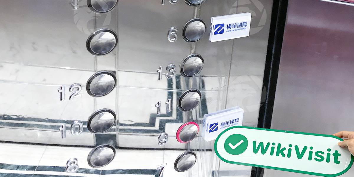 實勘人員進入大樓,在樓下電梯口發現,9樓和16樓的按鈕旁邊都有橫華國際的logo。據悉,這兩層樓都是該交易商的地盤。其規模之大由此可見。